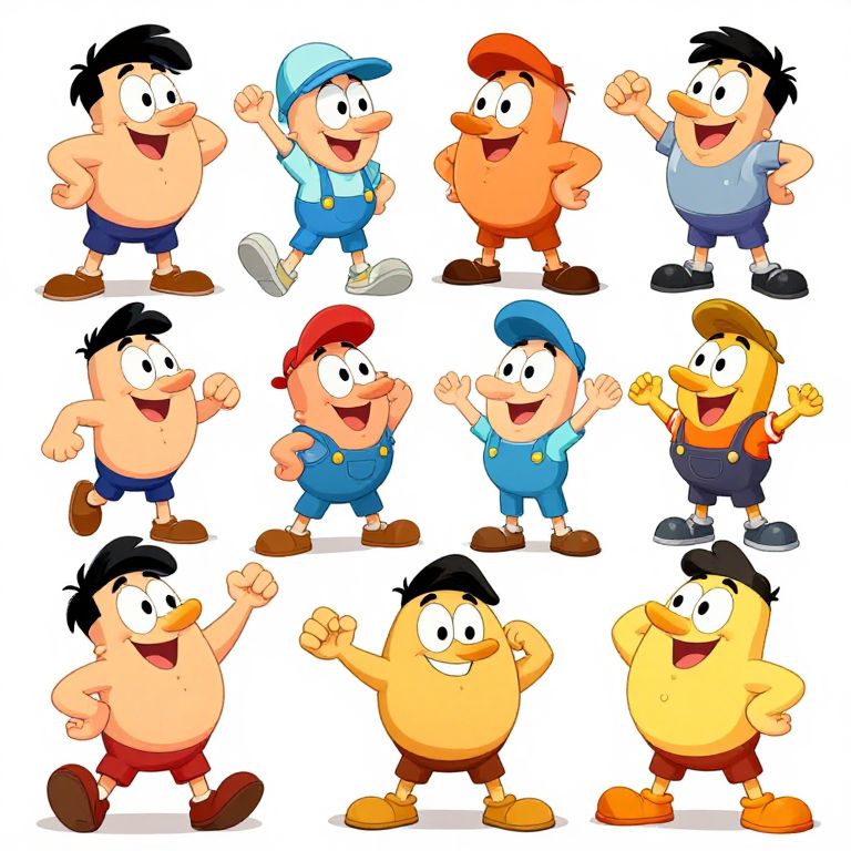 Cartoon drawing prompts, whimsical characters in vibrant colors, classic comic style, dynamic poses, playful expressions, detailed backgrounds, digital art
