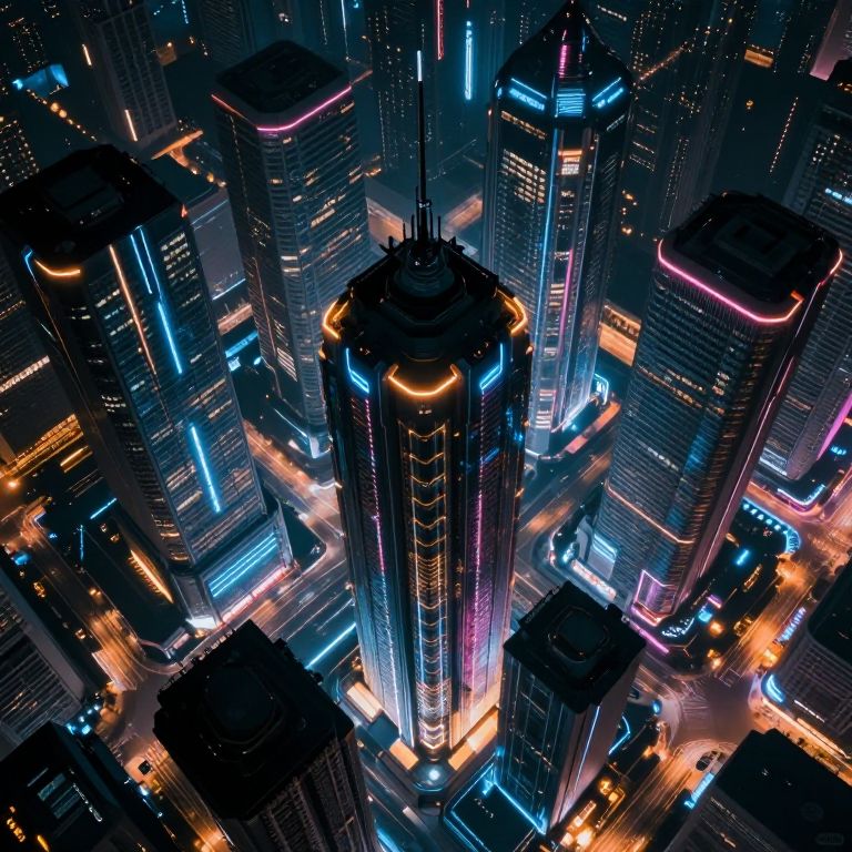 Aerial photograph of a futuristic cityscape at night, featuring tall skyscrapers illuminated with vibrant neon lights in blue, orange, and pink. The buildings have sleek, modern designs with vertical and horizontal light accents. The central skyscraper is prominently lit with orange lights at its base and blue lights along its edges. Surrounding buildings create a dense, grid-like pattern, with streets visible at the bottom. The overall scene is dark, highlighting the bright, colorful lights of the buildings, giving the image a cyberpunk aesthetic.