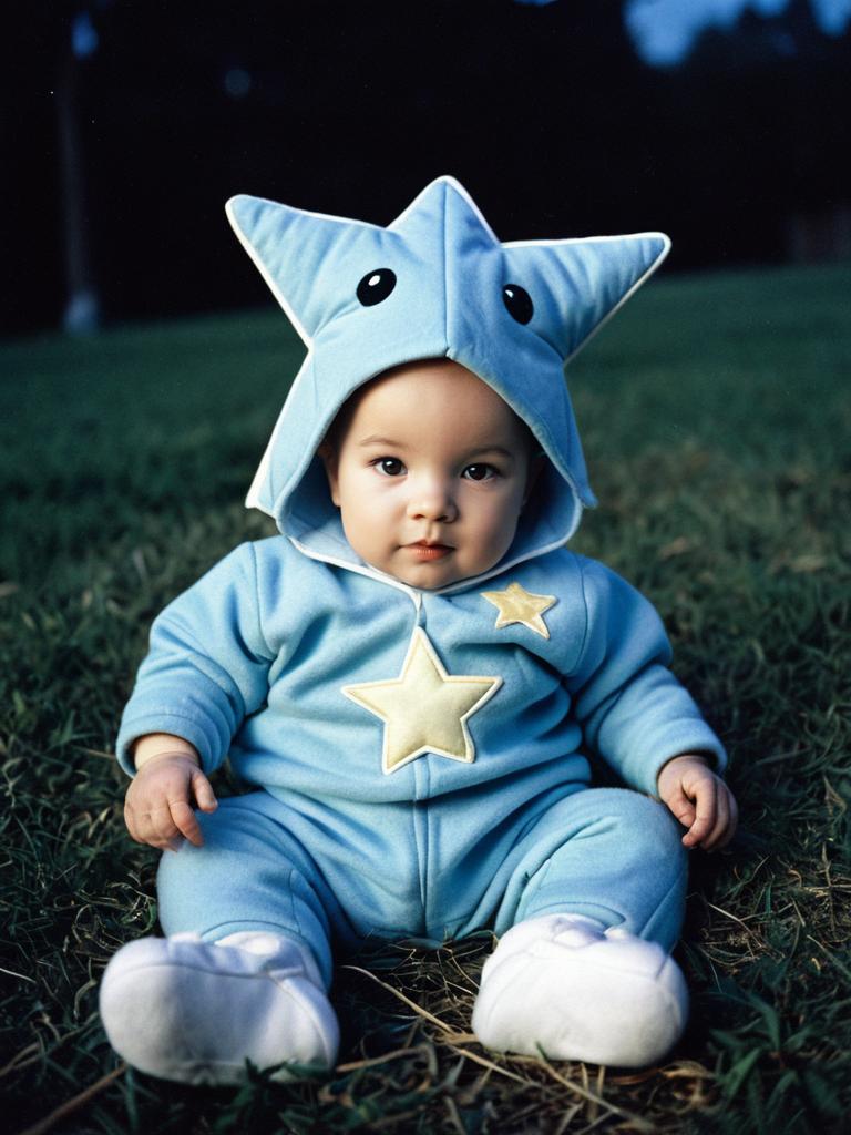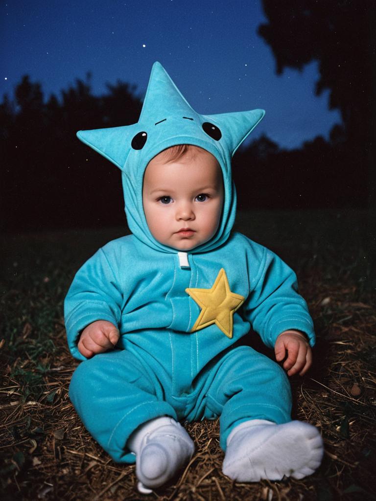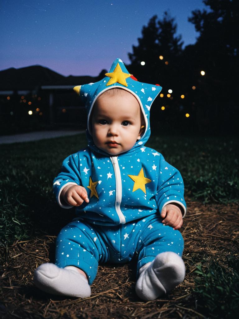 Infant in Baby Star Costume, photorealistic outdoor baby portrait at twilight