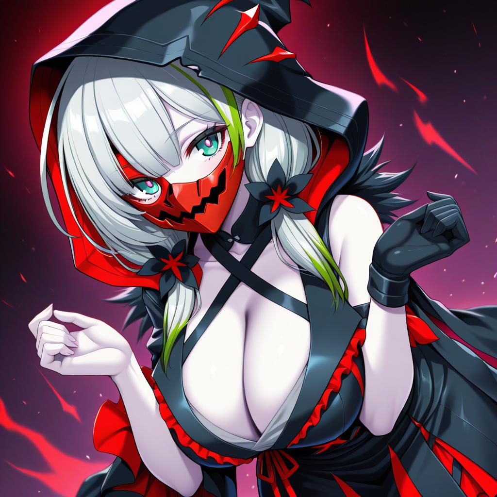 Digital anime-style illustration of a female character with pale skin, medium grey hair with green tips, and green eyes. She is dressed in a black and red hooded dress with one detached sleeve, revealing cleavage. The character wears a red stylized half mask and a single black glove, embodying a dark witch or duel monster aesthetic.