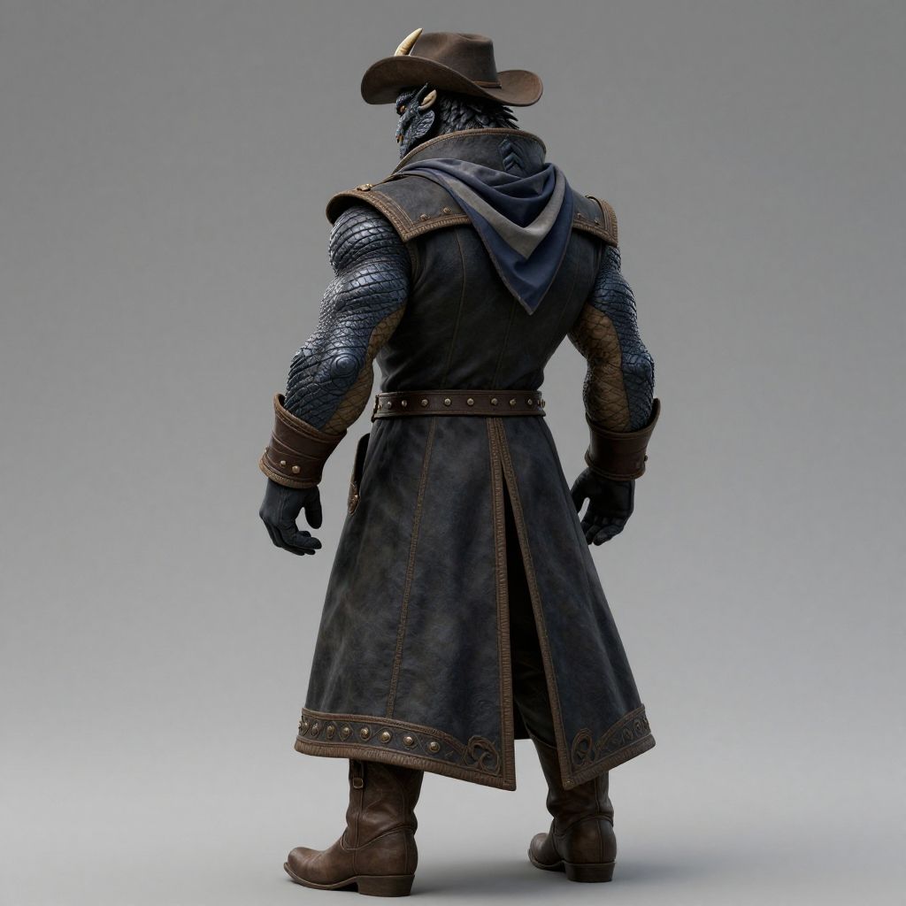 Male, Anthro, demihuman, muscular, dragon, western dragon, Eastern dragon, dragon skin, tow horn, clothed, clothing, ((cowboy wear, neckerchief, fluttering neckerchief.swaying neckerchief, coat, coat hem, stretched coat, Draw neatly all the way to the hem, cowboy hat, gloves, cowboy boots)) realistic hands, 8k hd, extreme detail, extremely detailed, 2d clear, simple background, Full body image, High resolution, Binarization, back view, lower half with coat cover