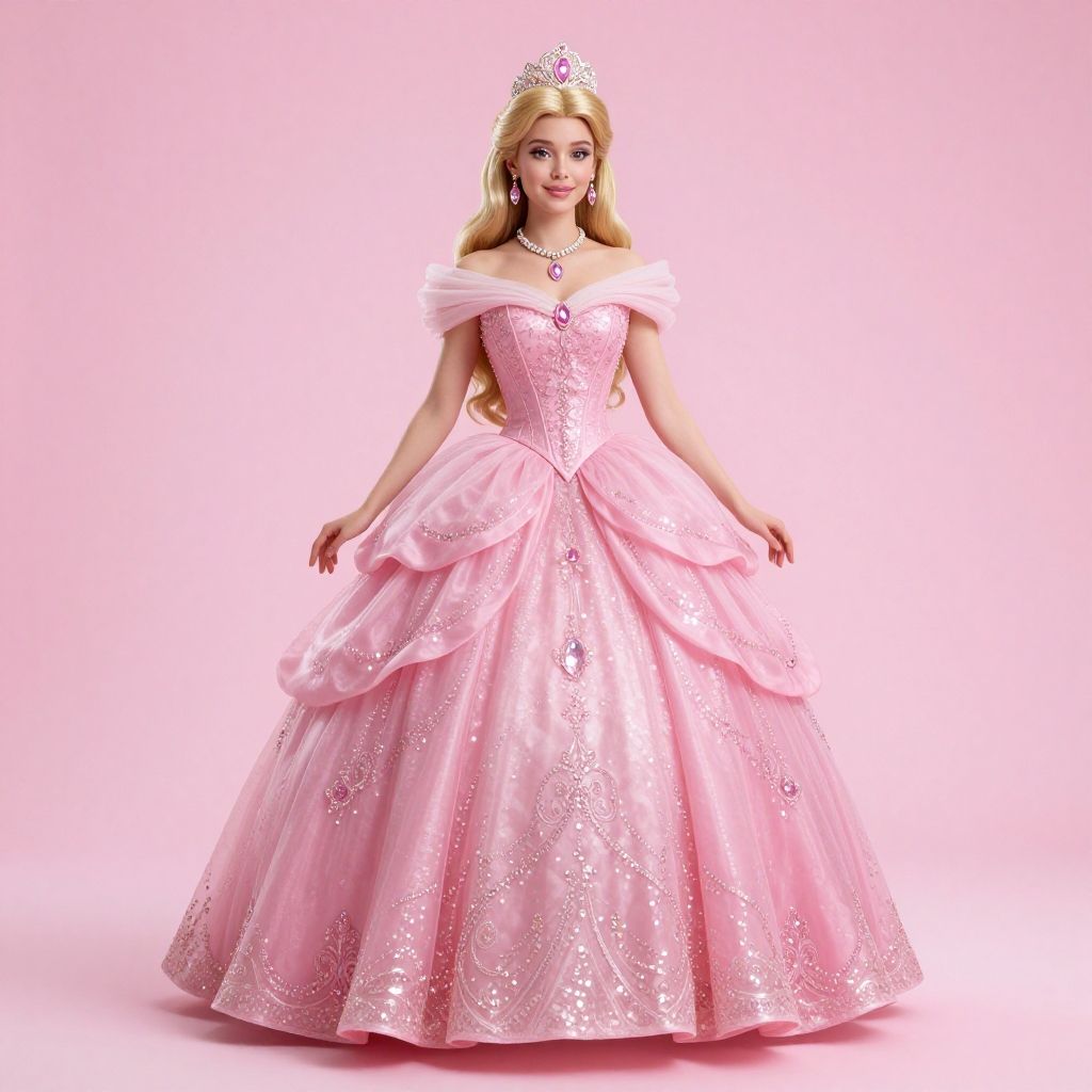 Full-length figure of a fairy tale princess with long blonde hair, wearing an elegant pink ball gown featuring multiple layers and intricate sparkling details. She accessorizes with matching earrings, a necklace, and a glittering tiara. The image is set against a pink gradient background.