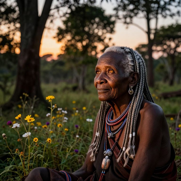 Imagine a portrait photograph of an African elder with warm amber eyes and silver braids. The soft golden light of dusk illuminates her as she sits amidst a dense forest canopy. From a unique perspective among wildflowers at her feet, we see the intricate details of her weathered face, etched with wisdom and laughter lines. Her pensive gaze extends into the distance, evoking an emotional gradient that blends reverence for ancient traditions with the raw beauty of nature. This scene captures the enduring spirit of this land's guardian.