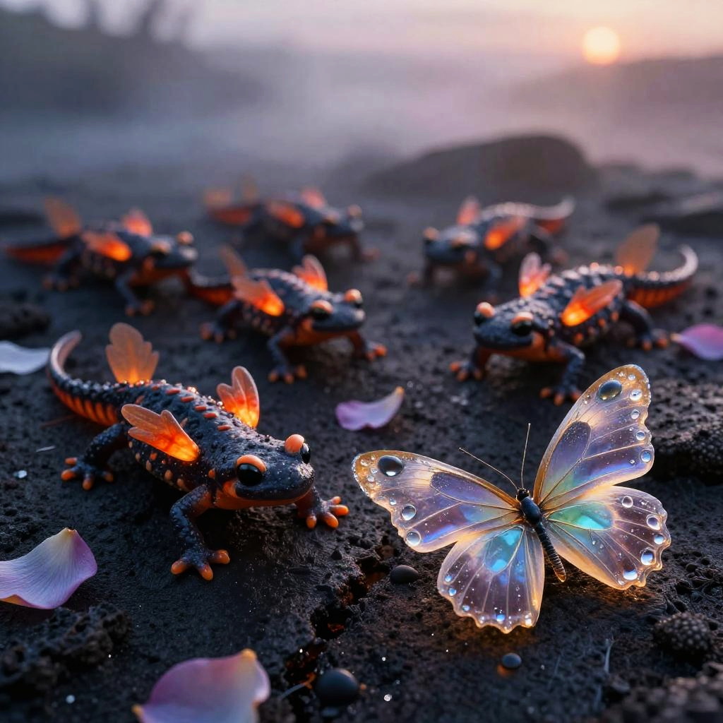 Celestial misty lava fields glowing at dusk, endearing small ember-scaled salamanders with ember wings prancing among petals, a butterfly in the foreground formed from molten glass filaments, dewdrops glitter, intricate textures, iridescent colors, macro realism, magical realism, hyperrealistic, volumetric light, soft bokeh, tactile details, storybook yet believable, 8k clarity