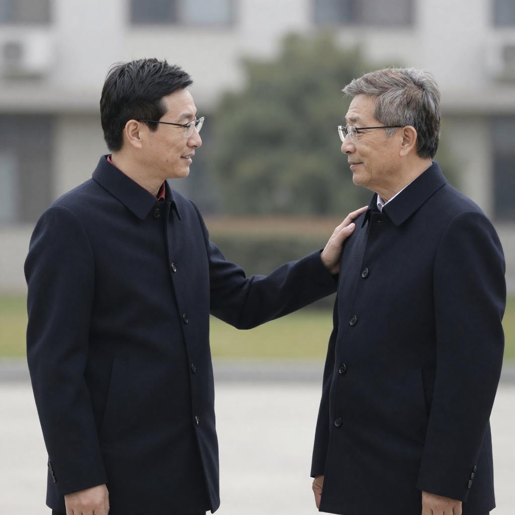 Photograph of three men standing on brick steps. The man on the left wears a light gray suit with a red and black striped tie, the middle man in a brown vest over a white shirt, and the right man in a green military-style cap and blue jacket. Background includes blurred people and a statue.