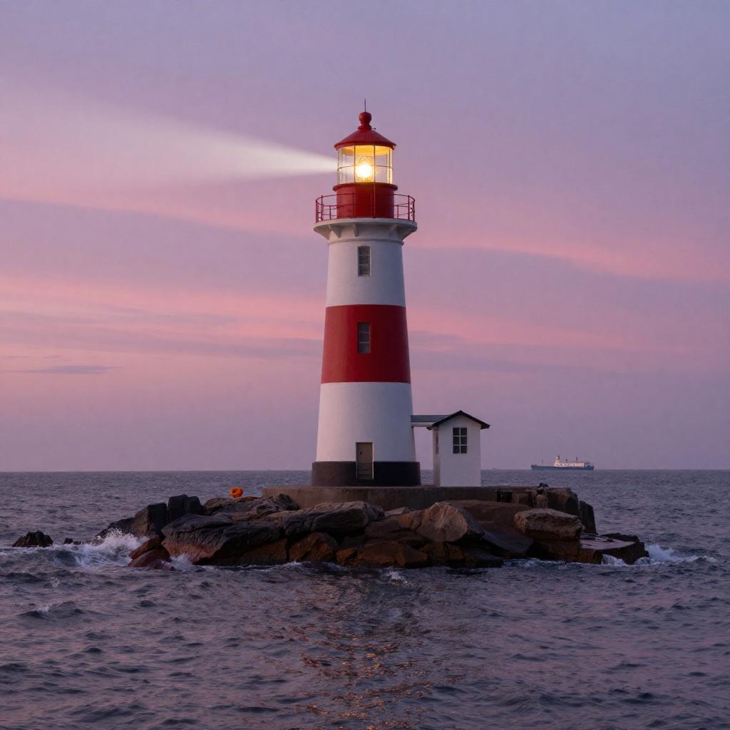 A picturesque lighthouse stands on a rocky island surrounded by ocean waves during sunset. The sky glows with shades of pink and purple, reflecting on the calm water surface. The lighthouse emits light, guiding ships at dusk.