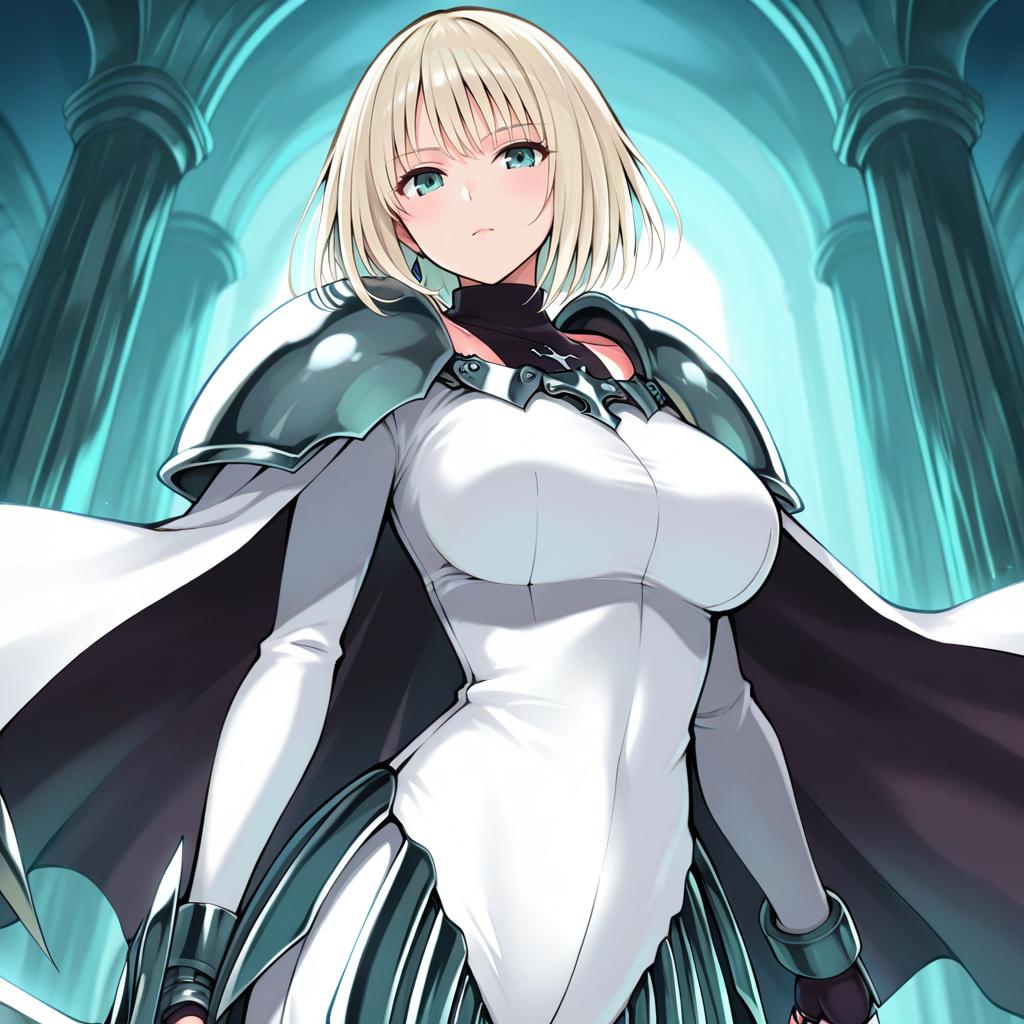 Clare (claymore), claymore (series), 1girl, grey eyes, blonde hair, short hair, armor, cape, sword, by artist hisen kaede, illustrious