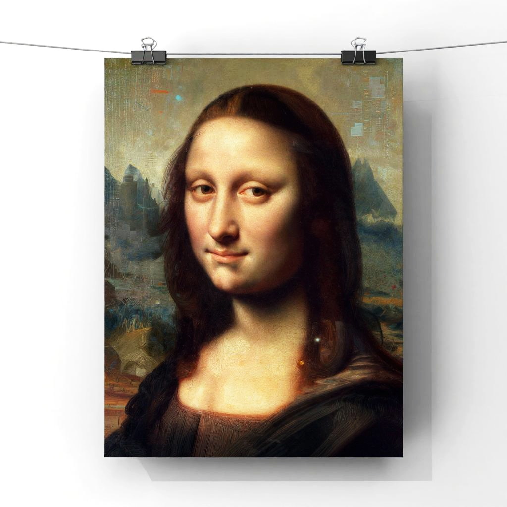 Digital artwork of the Mona Lisa with a modern twist; she has lighter skin and longer, darker hair, hanging on a clothesline.