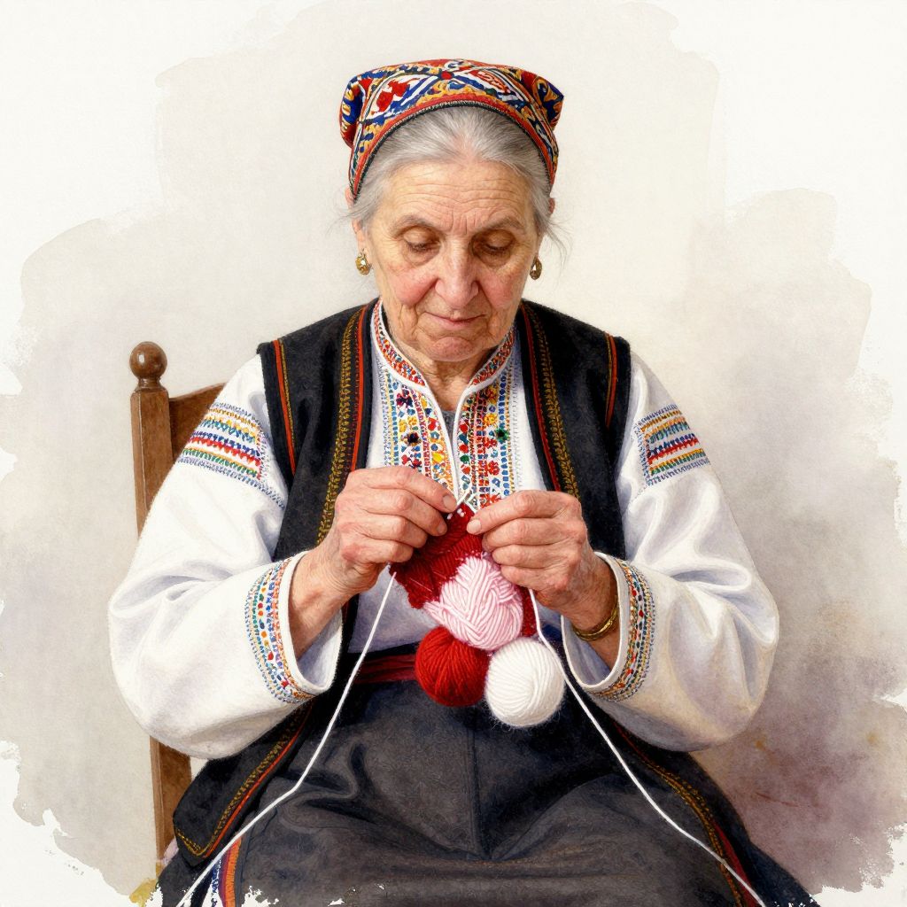 An elderly Bulgarian woman in traditional attire is depicted in a watercolor painting, engrossed in knitting with red and white yarn.