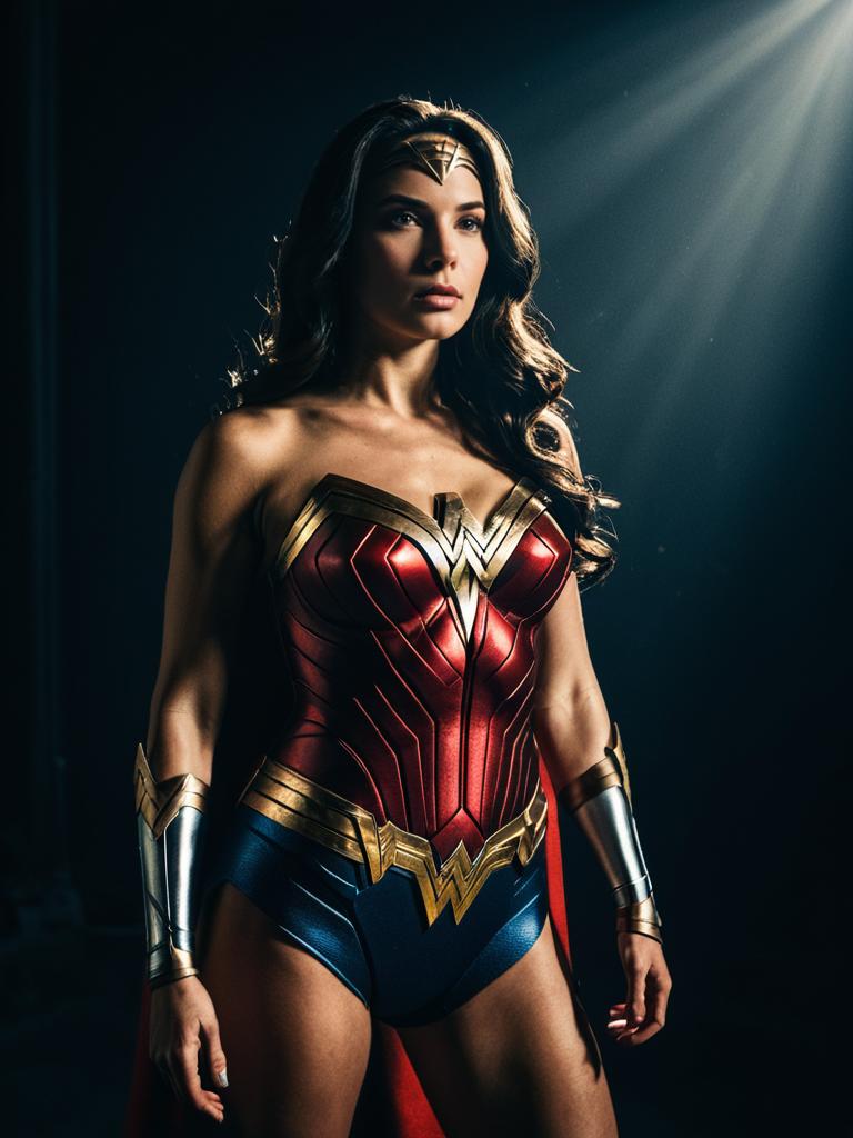 Woman in Wonder Woman costume, dramatic studio portrait with shadows