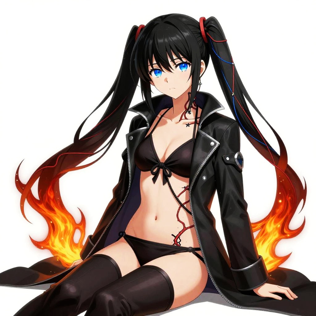 Digital anime-style illustration of a young woman with long black hair in twin tails, blue eyes, and fair skin. She wears a black bikini top, black panties, and a black jacket with silver zippers, complemented by black thigh-high stockings. Her hair has red tips, and fiery orange and red flames emerge from her sleeves. The background is plain white, emphasizing her striking appearance. She sits with a relaxed posture, slightly leaning back, with a calm yet intense expression. The overall style is vibrant and dynamic, with sharp lines and bold colors.