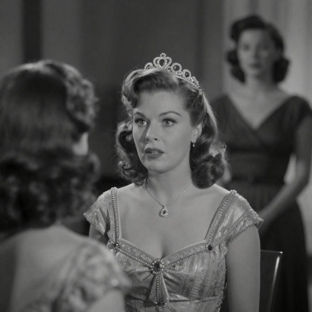 Vintage movie poster with two women. Left woman, dark hair, white shirt, light blue skirt, holding cigarette, looking at right woman. Right woman, blonde hair, red dress, black bow, looking down, hands together. Background: dark wall, shadowed. Chair between them.