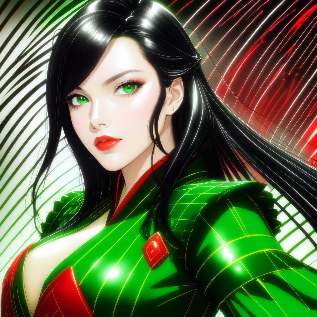 Asami sato, avatar legends, 1girl, red lips, lips, green eyes, eyeshadow, long hair, black hair, large breasts, medium breasts, lipstick, by artist daiaru, anime