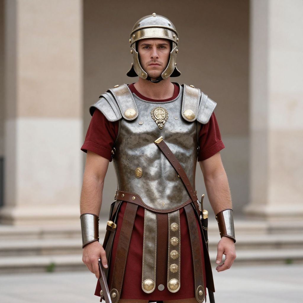 Photograph of a young man standing in front of a blurred architectural background. He wears a Roman-style silver helmet with a face guard, a silver breastplate with gold accents and a red tunic underneath, and a brown leather skirt with gold buttons. His arms are adorned with silver bracers. The man has a serious expression, light skin, and short brown hair. The background features tall, beige columns, suggesting an ancient or historical setting. The image has a realistic, slightly over-saturated style, enhancing the metallic and leather textures.