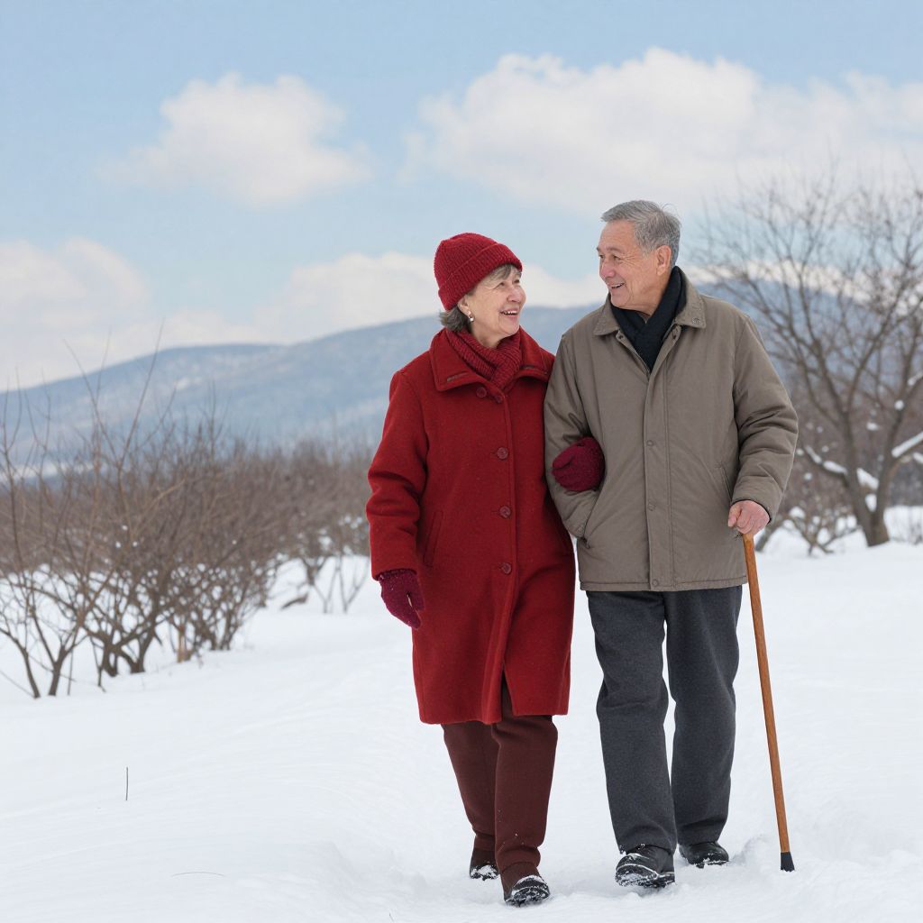 Photograph of an elderly couple walking in a snowy landscape. The woman, with short black hair, wears a red knit hat, red coat, brown pants, and black boots. The man, with gray hair, wears a beige jacket, black pants, and black shoes, holding a wooden cane. They stand close, smiling at each other, with bare trees and snow-covered ground in the background, and mountains visible under a blue sky with scattered clouds. The scene is bright and cheerful, capturing a moment of warmth and connection amidst winter.