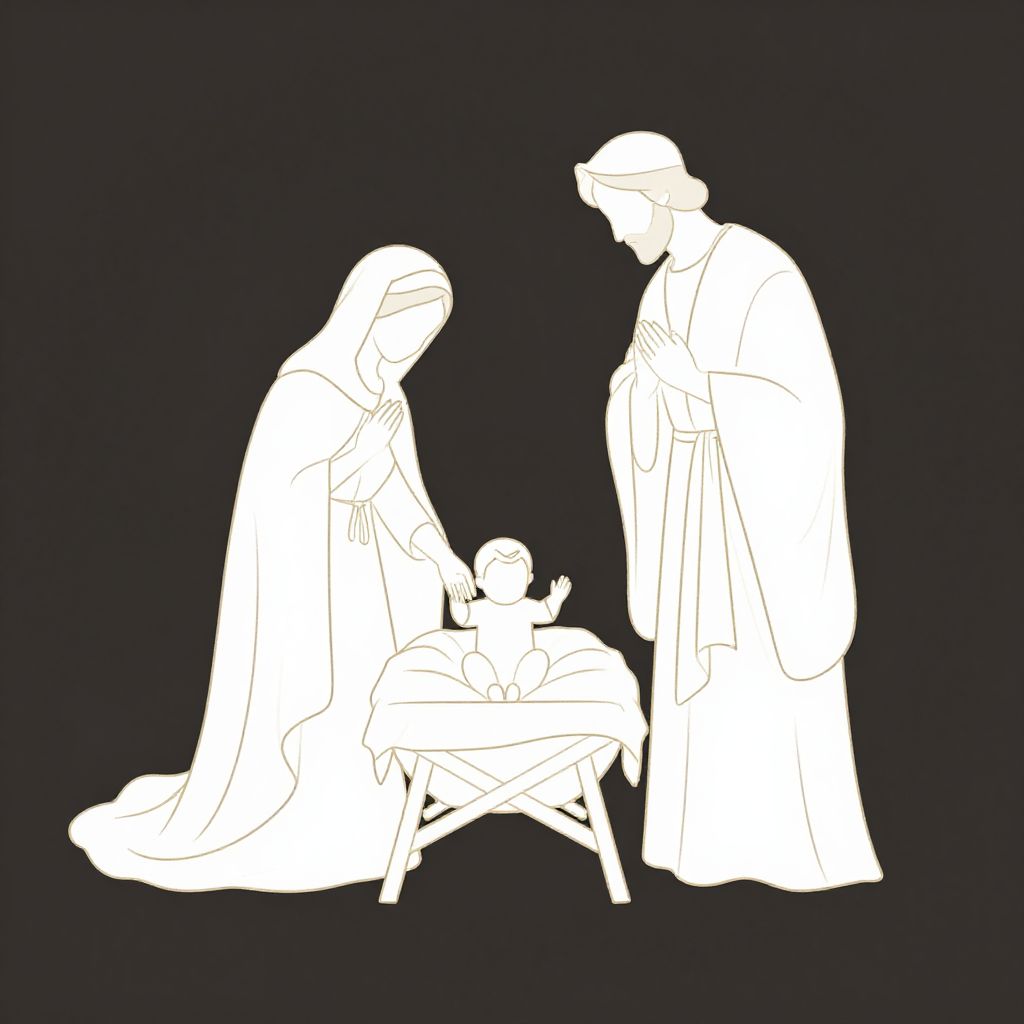 Nativity line art showing Mary, Joseph, and baby Jesus in a manger, elegant delicate lines with minimalist style, abstract yet recognizable figures, simple smooth curves highlighting the sacred scene, monochrome with light shading