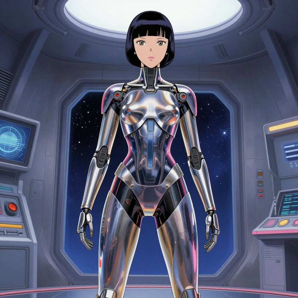 Digital artwork of a sleek, silver robotic woman with black bob haircut, standing in futuristic spaceship control room, illuminated by overhead light.