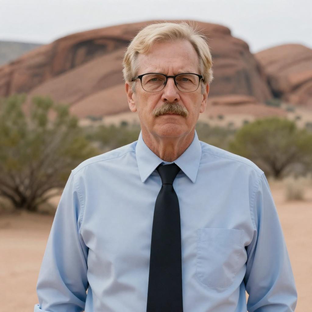 Middle-aged man with short blonde hair, glasses, and a mustache, wearing a light blue shirt and black tie, stands in a desert landscape with green shrubs and large red rock formations in the background. His expression is serious and focused. Photographic image.