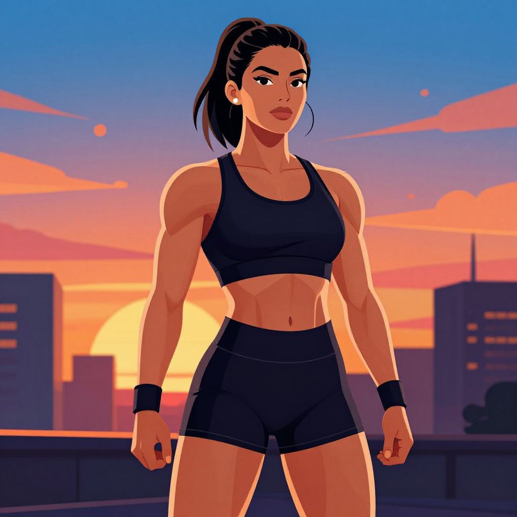 A digitally illustrated athletic woman with a highly defined muscular physique stands confidently against a vibrant urban sunset backdrop. The image features bold colors and sharp contrasts, emphasizing her strength and determination in a modern, stylized art style.