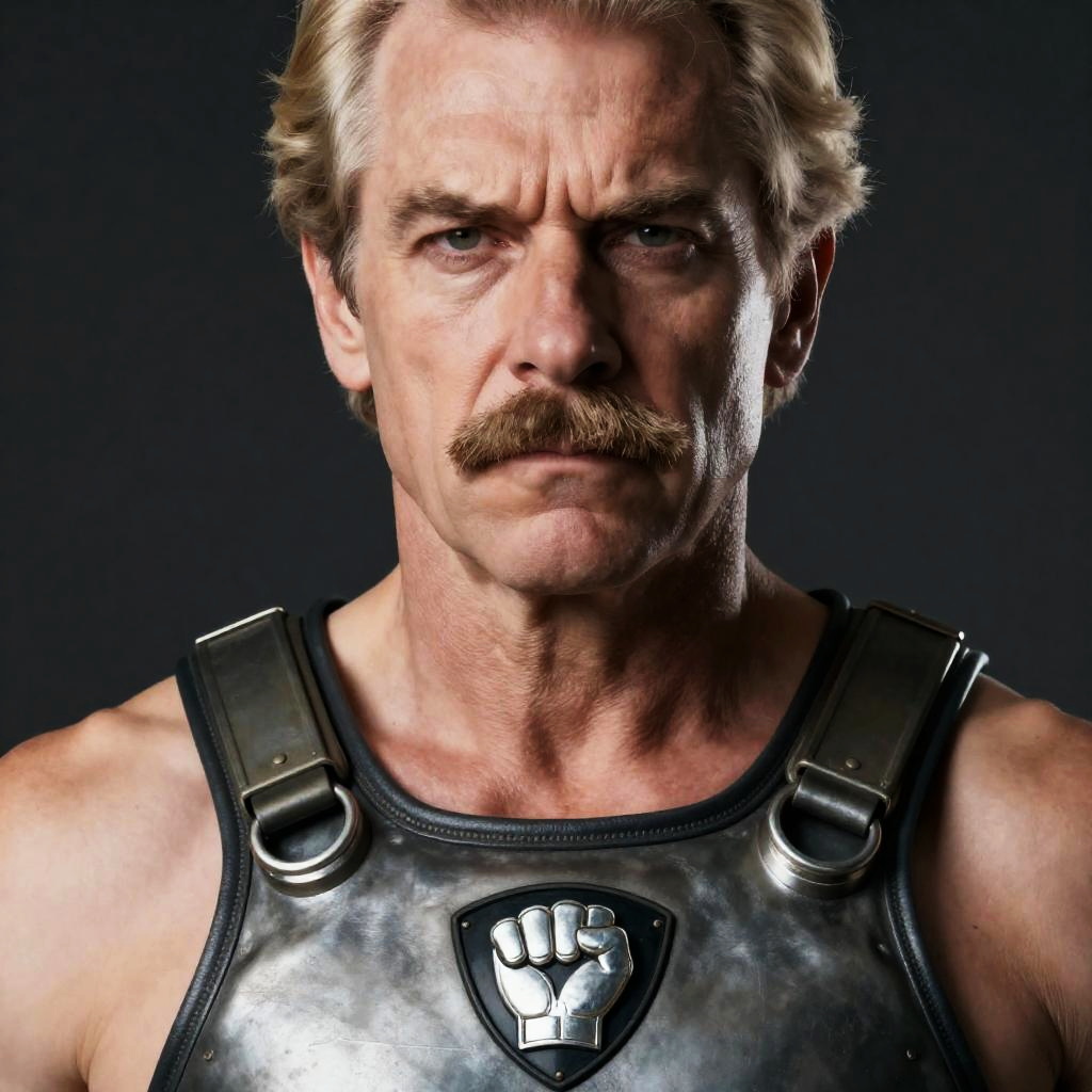Photograph of an older man with blonde hair and a mustache, wearing a metallic chest harness with a black, silver-fist emblem. His expression is intense, with furrowed brows. Dark background. Close-up shot. Upper body visible.