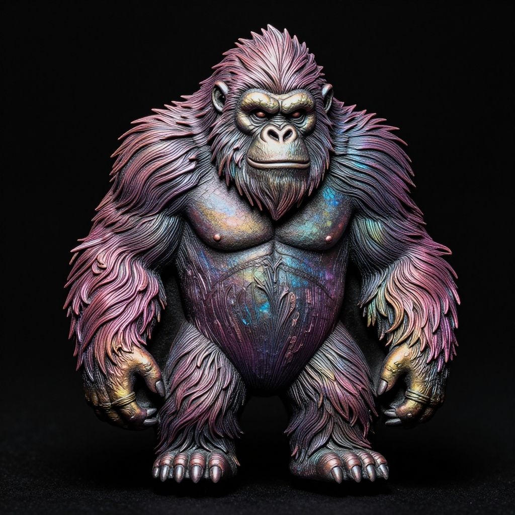 Digital art of a muscular, anthropomorphic gorilla with glowing, multicolored fur against a black background, standing confidently with arms slightly bent.