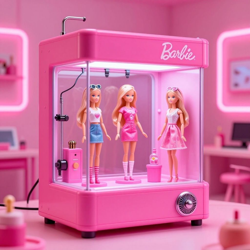 Barbie generator machine in a futuristic workshop, vibrant colors and soft lighting, detailed mechanical parts creating bright and stylish Barbie dolls, surrounded by pink neon lights and playful accessories, highly detailed digital art.