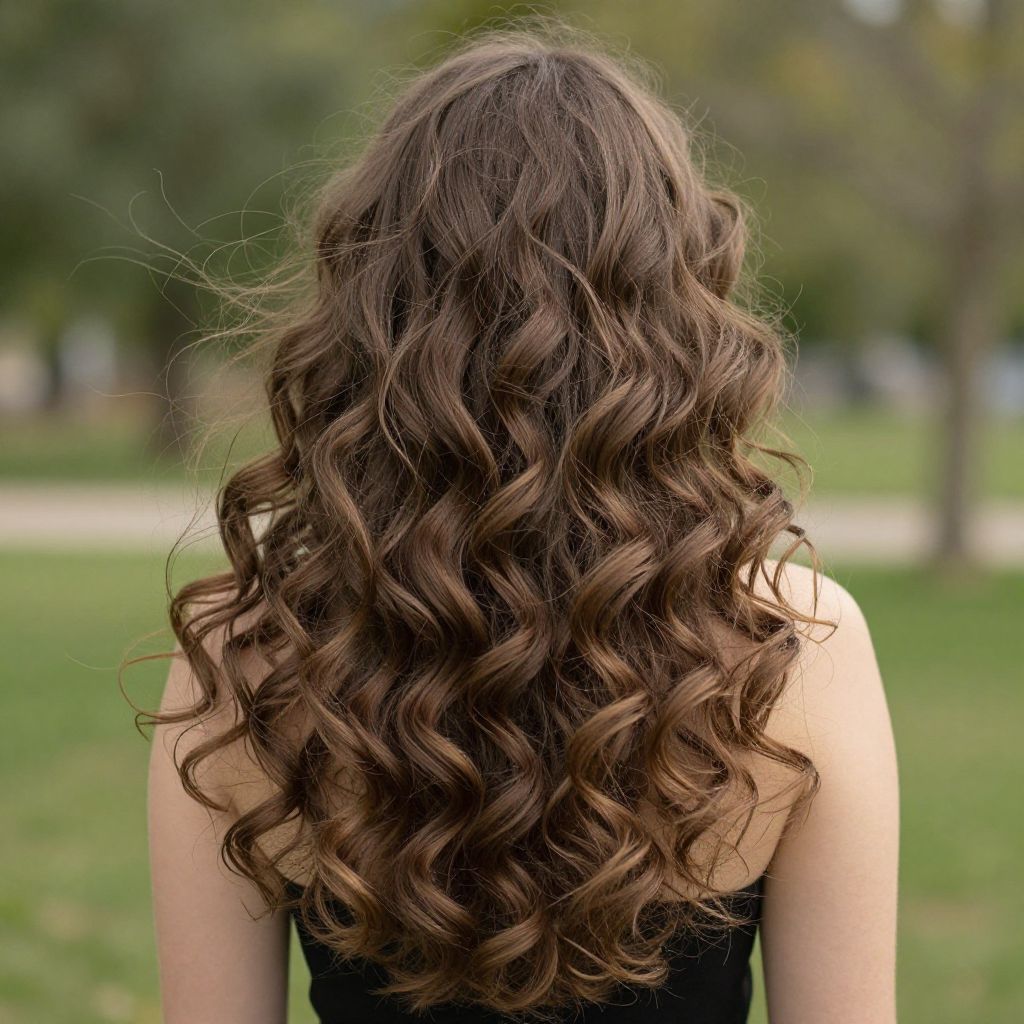 Photograph of a woman seen from behind, focusing on her long, wavy brown hair that cascades down her back in loose curls. She is wearing a sleeveless black top. The background is a blurred green park with trees and a grassy lawn, suggesting an outdoor setting. The image emphasizes the texture and natural flow of her hair against the soft, natural greenery backdrop, creating a serene and relaxed atmosphere.