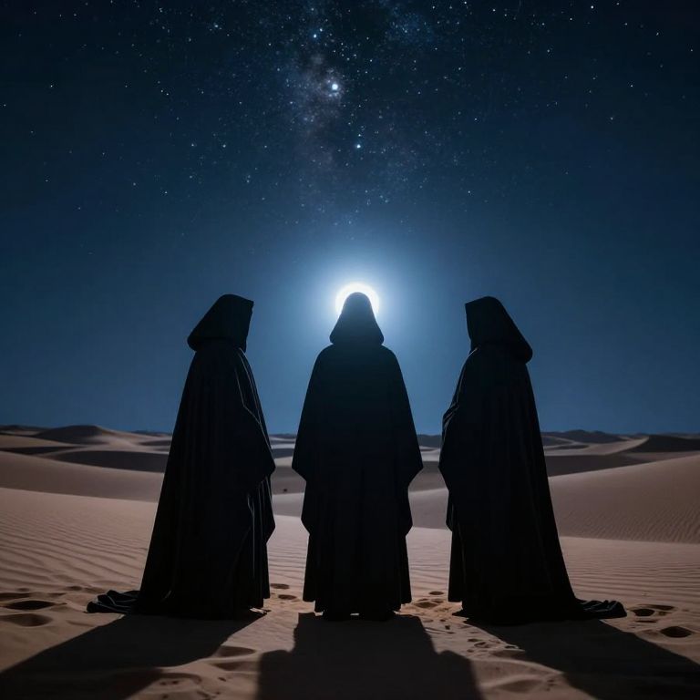 Three cloaked figures stand in a serene desert landscape under a starry night sky, their silhouettes illuminated by a radiant celestial light, evoking a mystical and otherworldly atmosphere through high-definition digital artistry.
