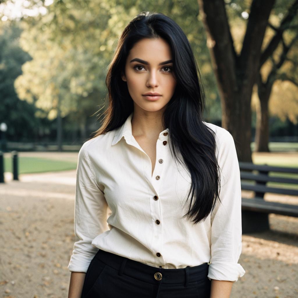 A realistic portrait of a young woman with long black hair and striking eyes, wearing a fitted white button-up shirt and slim black pants, soft and subtle lighting accentuating smooth skin texture, warm brown and beige colors, detailed facial features, an outdoor park background