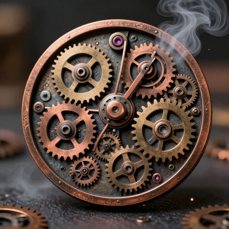 Circle token embedded in a steampunk mechanical clockwork, surrounded by gears and cogs, bronze and copper tones, steam and sparks emitting softly, intricate craftsmanship, close-up macro shot with dramatic lighting