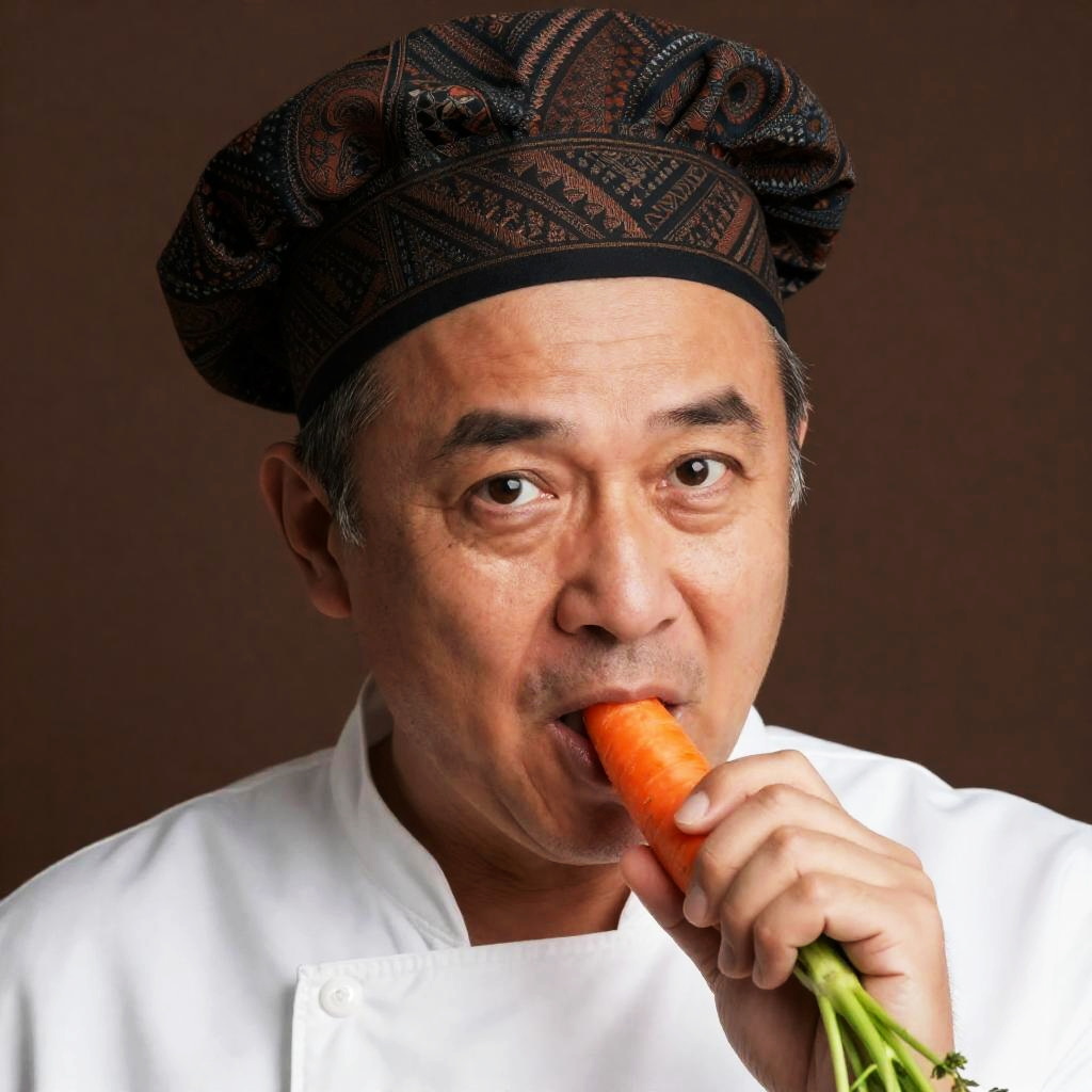 Middle-aged man with light skin and brown eyes, wearing a patterned chef hat and white shirt, biting into a large carrot with green tops. Background is dark brown. His expression is serious and focused. Close-up portrait.