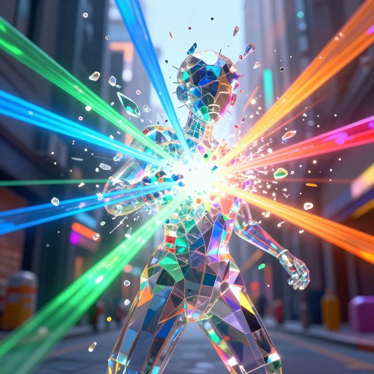 The image depicts a highly detailed, low-poly character made of transparent glass, exploding with vibrant energy beams in a psychedelic retrofuturistic street. The character's form is androgynous, with a face that appears to be shattering into crystal fragments, emitting a rainbow of colors. The energy beams, in hues of blue, green, and orange, are shooting outwards, creating a dynamic and explosive effect. The background is a mix of dark and light shades, with crystal particles floating around the character, adding to the ethereal and transient atmosphere. The overall composition is intricate, with the character's body and energy beams interacting in a complex, almost chaotic manner, suggesting a moment of intense transformation or power release. The scene is rich in texture, with the glass-like material of the character reflecting the surrounding colors, and the energy beams creating a sense of depth and movement.