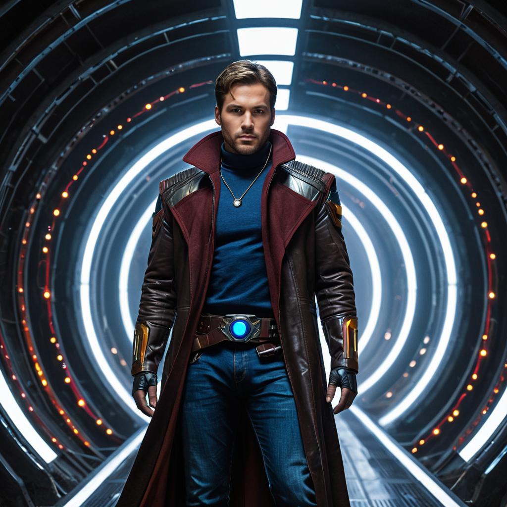 Starlord costume man, photorealistic, man standing, superhero costume, long dark brown leather coat with metal accents, dark red turtleneck, blue jeans, brown belt, short brown hair, serious expression, sci-fi background, dark circular tunnel with colorful lights, CGI, movie poster style, character from Marvel, rich ures, detailed clothing, dynamic lighting, front view, realistic shading