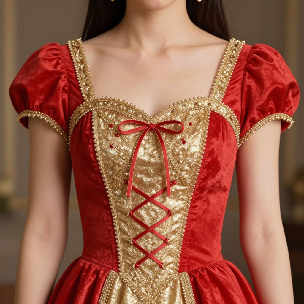 Top Fancy Costume, a close up of a woman in a red and gold dress