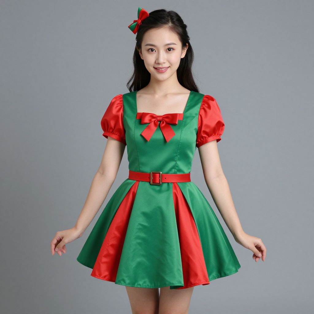 Photograph of an Asian woman with long black hair wearing a festive green dress with red puffy sleeves, a red bow on the chest, and a red belt. The dress features red and green stripes on the skirt. She has a small red bow in her hair, smiling slightly, and stands against a plain grey background. The dress has a slightly flared skirt and a square neckline. The overall style is playful and Christmas-themed.