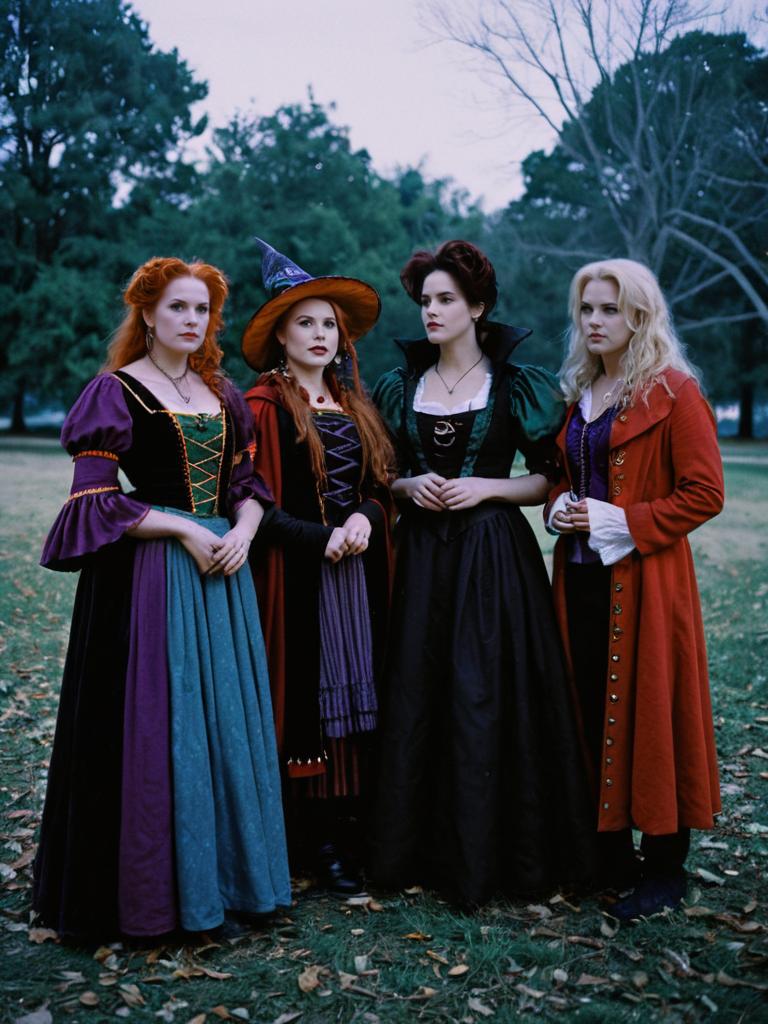 Group in Hocus Pocus Cosplay, photorealistic outdoor portrait at twilight