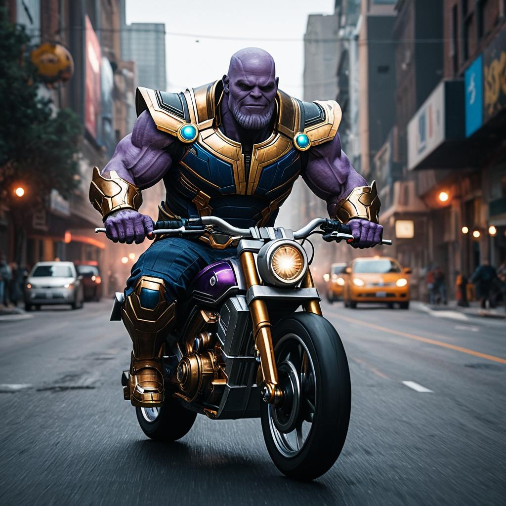 Hyperrealistic image of Thanos, a muscular purple fictional character, riding a motorcycle on a busy urban street. Thanos is wearing detailed gold and blue armor with glowing blue accents. The scene features dynamic lighting and a blurred city background with cars and pedestrians.