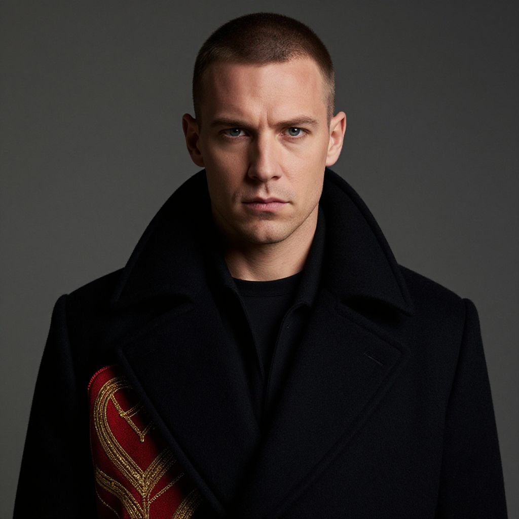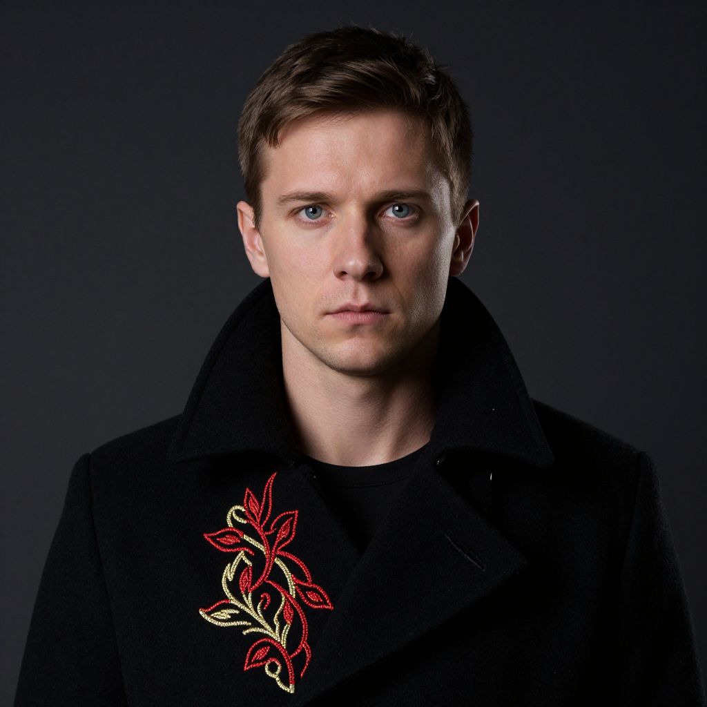 Photograph of a serious-looking Caucasian man with short brown hair, light skin, and blue eyes. He's wearing a black coat with a red and gold embroidered pattern on the left side. The background is a solid dark gray, making him stand out. The lighting is soft but focused, highlighting his face and coat. His expression is neutral, and he's centered in the frame.