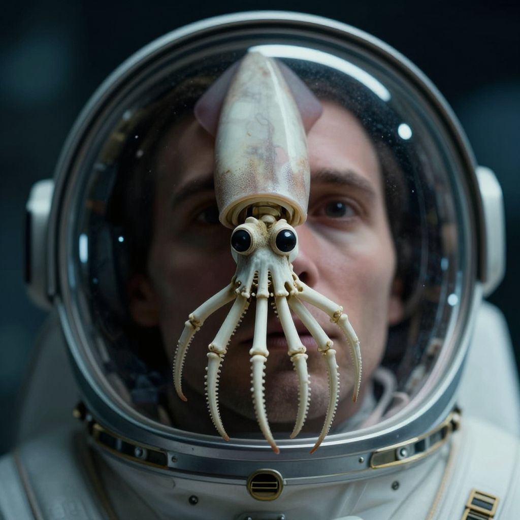 Photograph of a man in a white space suit with a clear helmet, focusing on a realistic, detailed squid head inside the helmet. The squid has large black eyes, a translucent, slightly textured body, and multiple tentacles with visible suction cups. The man's face is blurred in the background, emphasizing the squid. The helmet's reflective surface shows light reflections. The background is dark, creating a stark contrast with the white space suit and the squid. The image has a surreal, sci-fi feel, blending human and marine elements in a space exploration context.