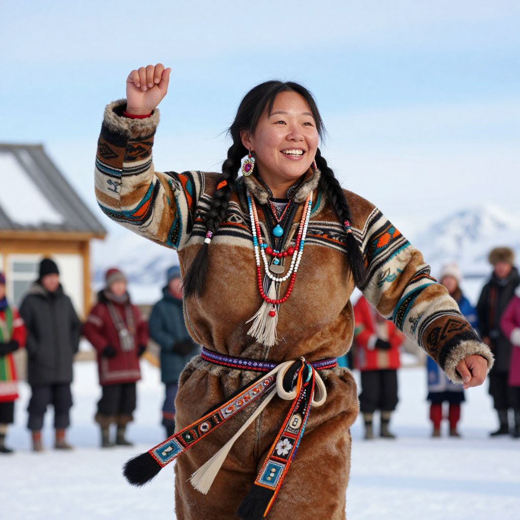 A dynamic shot of a vibrant Inuit woman with warm brown skin, full lips, and a bright smile, wearing a full Inuit costume including a patterned woolen jacket, beaded necklaces, and traditional accessories, dancing in a traditional village gathering under a bright Arctic sky.. The woman has big breasts and cute face