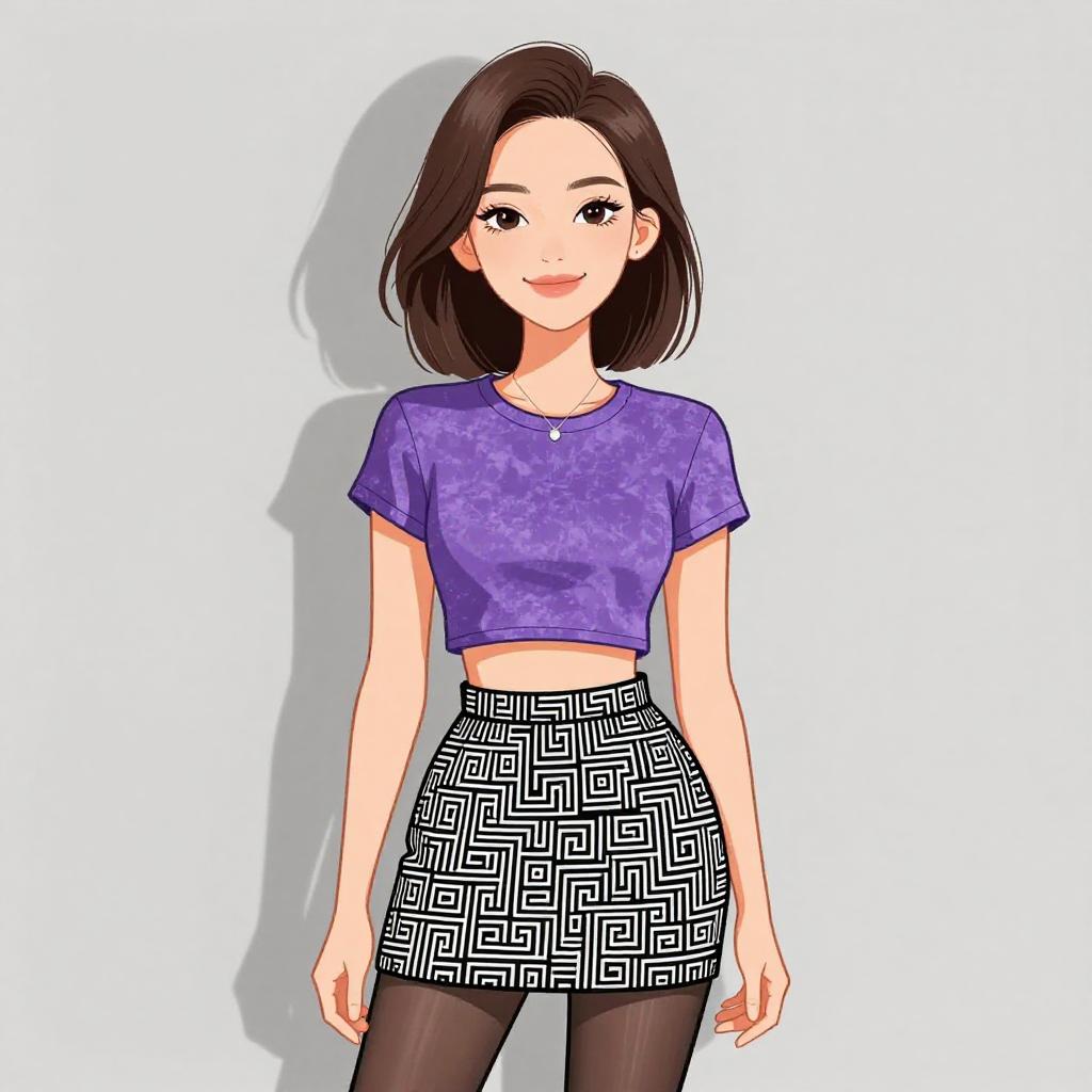This digital illustration depicts a young Asian woman with fair skin and straight, shoulder-length black hair. She has a small, delicate nose, and is smiling softly. She wears a short-sleeved, purple crop top and a high-waisted, black and white patterned skirt with a geometric design. Her black tights complement her skirt. The background is plain white, with a subtle shadow cast to her left. The art style is vibrant and cartoonish, with clean lines and bright colors. The woman's pose is relaxed, with her arms hanging naturally by her sides.