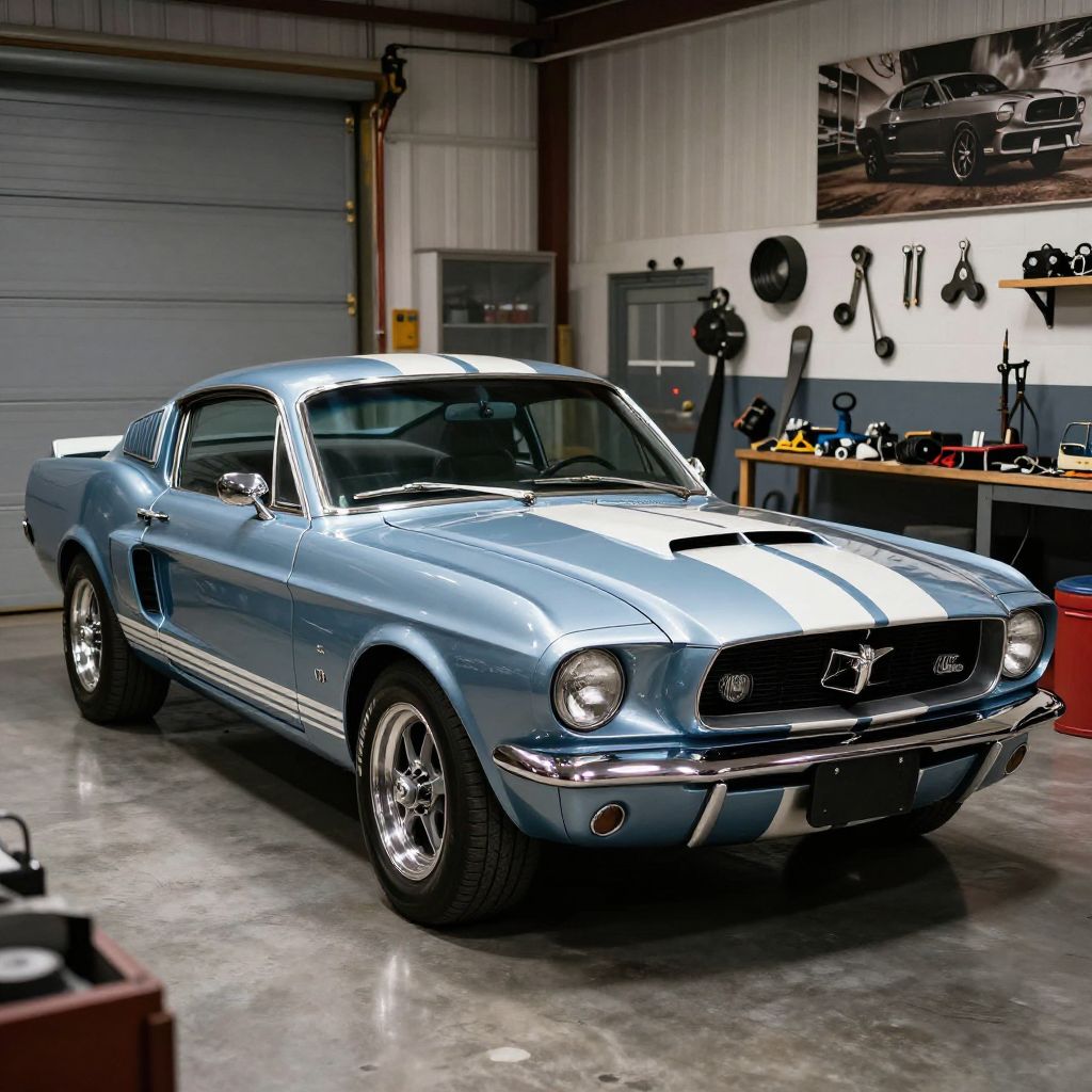 Shelby GT5000 in a vintage garage setting, surrounded by classic car tools and memorabilia, soft ambient lighting emphasizing muscular curves and polished metalwork