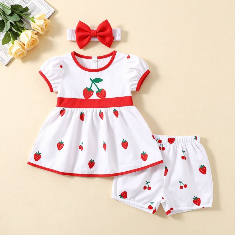 Infant Baby Toddler Sweet Strawberry Round Neck Short Sleeve Princess Dress+Shorts+Headband Three Piece Suit Outfit QZ4058P cherry_90