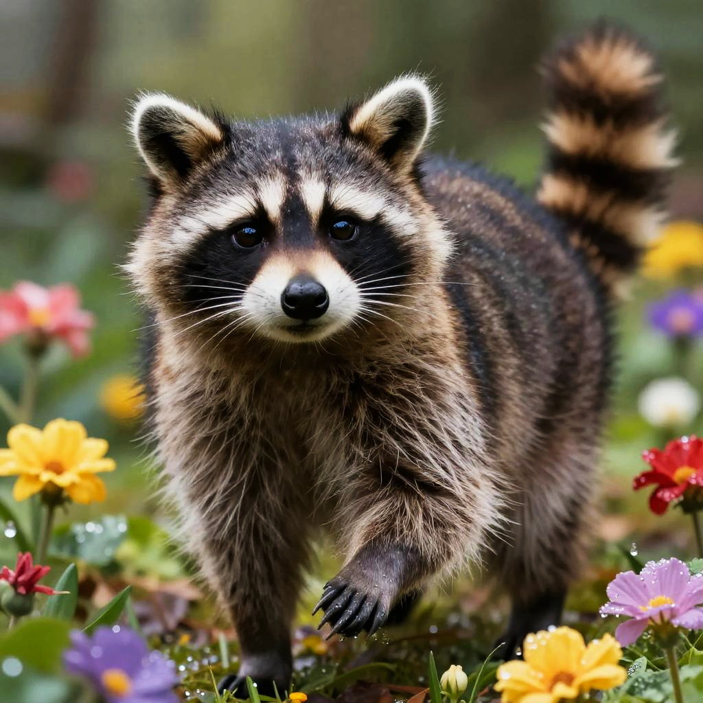 Raccoon mixed with cat, playful hybrid animal blending feline grace and raccoon’s mischievous expression, exploring an enchanted garden filled with colorful flowers and sparkling dew, hyper-realistic style with vivid colors and intricate fur textures.