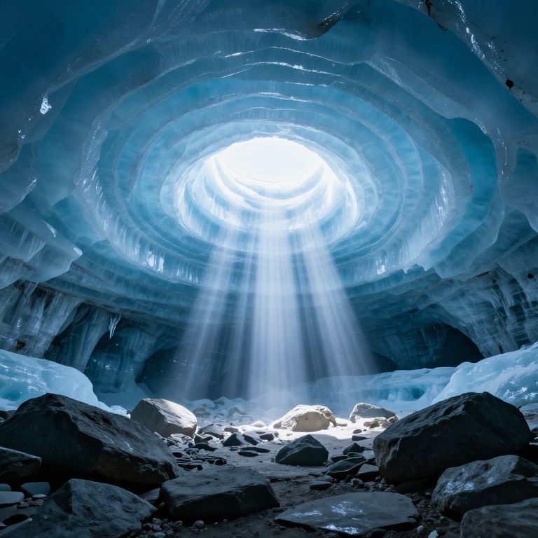 Radiant beams pierce through the translucent layers of a cavernous ice formation, illuminating a rugged stone floor strewn with dark boulders beneath a mesmerizing, concentrically layered ceiling of frozen blue hues.
