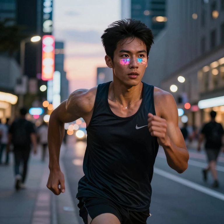 Photograph of a muscular Asian man jogging in a city street at dusk, wearing a black tank top and shorts, with colorful light reflections on his face