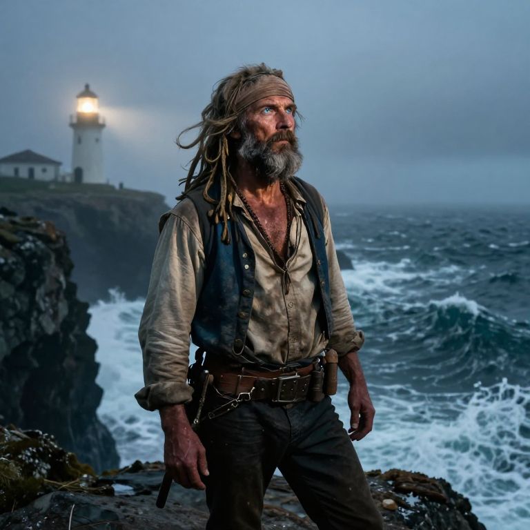 Photograph of a rugged, middle-aged man with long, disheveled brown hair and a full beard standing on a rocky cliff by the ocean. He wears a worn, buttoned-up white shirt under a dark vest, and brown pants with a leather belt. His weathered skin and intense gaze suggest resilience. In the background, a white lighthouse with a bright, glowing light stands on another rocky cliff, partially obscured by misty, overcast skies. Powerful waves crash against the rocks, adding a sense of danger and adventure to the scene. The overall color palette is cool with shades of blue and gray.