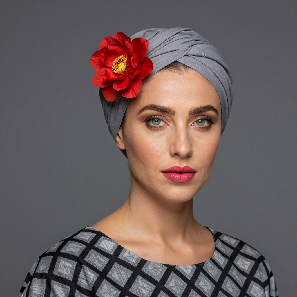 Photograph of a woman with closed eyes, red lips, and light skin. She wears a turquoise headscarf with red poppy flower and seashell patterns, and a black and beige patterned top. Background is solid gray. She has a serene expression. Her head is tilted slightly to the left. Upper body is visible.