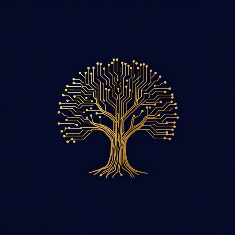 Viewer Engagement Minimalistic logo of Tree of Life drawng in golden lines and digital circuits to symbolize advanced artificial intelligence, no text, dark-navy background,