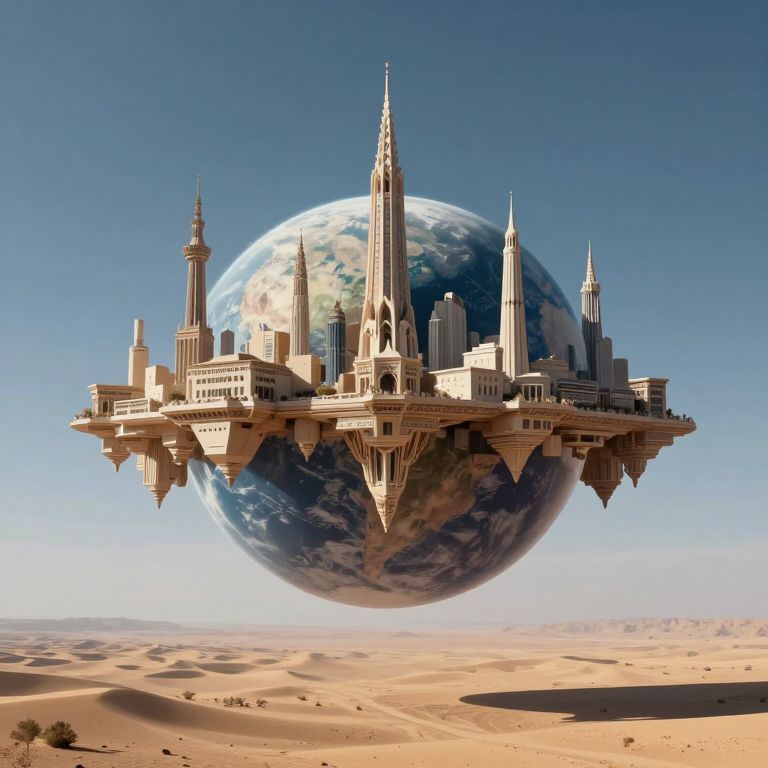 Suspended between earth and sky, a gravity-defying metropolis floats above a desolate desert, its inverted towers reaching toward the heavens like ancient dreams of transcendence, evoking a surreal blend of wonder and existential solitude.